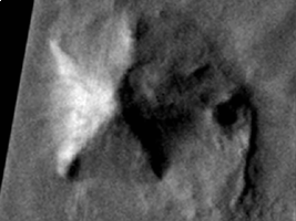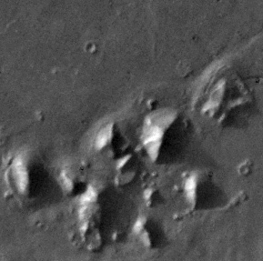 Although one could dismiss a single object as an optical illusion, the presence of other nearby features that are quite unusual themselves is harder to ignore. About 14 km west-southwest of the Face is a collection of unusual-looking landforms dubbed the “City” by author Richard Hoagland. Where the Face is a rounded formation, classified geologically as a mesa or knob, the City is composed of a number of pyramidal structures with angular sides.