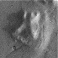 To help in visual interpretation, the imagery was enhanced using several techniques. Over large areas, a local contrast stretch algorithm was used to remove shading variations due to illumination and albedo variations across the imagery, and increase local contrast while maintaining overall tonal balance. Over small areas and for isolated features the contrast was enhanced using a simpler “clip-and-stretch” algorithm that assigns pixels below a low clip value to zero, pixels above a high clip value to 255, and pixels in between to the range 1-254. Two enhanced views of the Face are shown below from 35A72 (left) and 70A13 (right) after noise removal and clip and stretch. The images were magnified using a cubic spline technique, which uses the values of pixels in a 5×5 window to interpolate intermediate pixel locations.