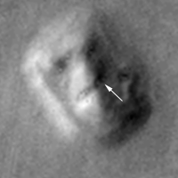 The lateral stripes are enhanced by horizontal averaging in a rotated version of 35A72 (above right). The stripes are not in the same direction as sensor scan lines. They do not show up as well in the higher sun angle Viking frame 70A13, suggesting they may be the result of topographic variations, which are more evident at lower sun angles, rather than differences in albedo. Several crossed lines in the forehead area (above left) are also evident. These lines are also visible in 70A13, which increases the likelihood that they are real features and not sensor artifacts.