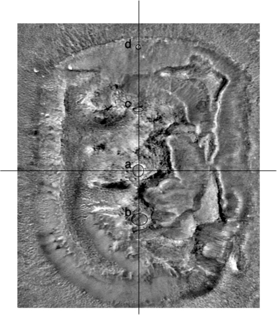 Professor Crater had published an analysis of the spatial distribution of mound-like features to the southwest of the Face in JSE a few years earlier. In his 1999 paper, Crater and co-author Professor Stanley McDaniel showed that a group of formations in the Cydonia area of Mars of relatively small and nearly uniform size have relative positions that repeatedly display symmetries in the apparent form of related right and isosceles triangles.