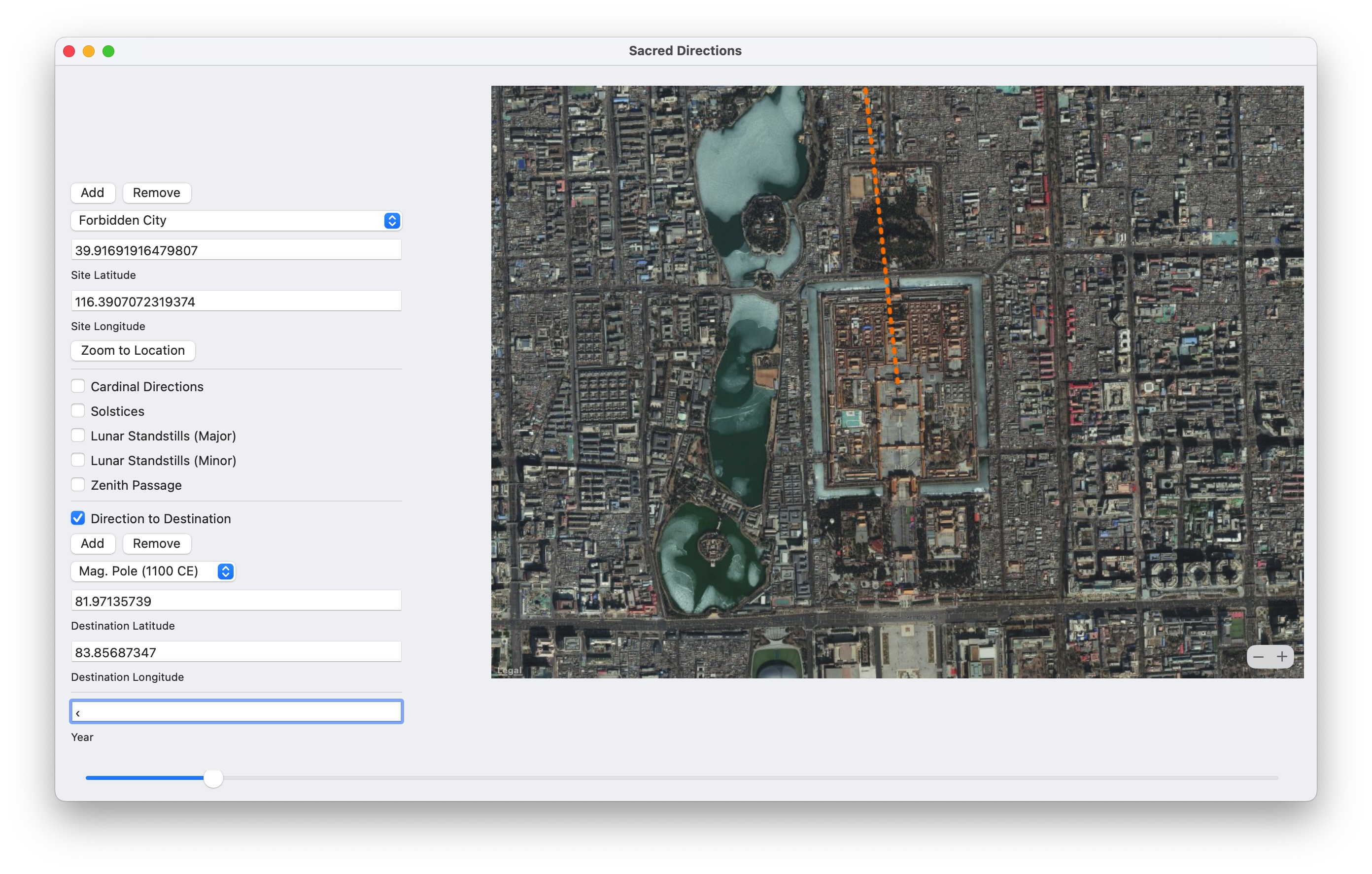 Numerous sites in China were aligned to geomagnetic north at the time of construction. One example is the Forbidden City which was built between 1100 and 1200 CE. Instead of using the time slider to change the geographic pole reference as above, alignments to older geomagnetic pole locations are stored in a destinations file that can be downloaded below.
