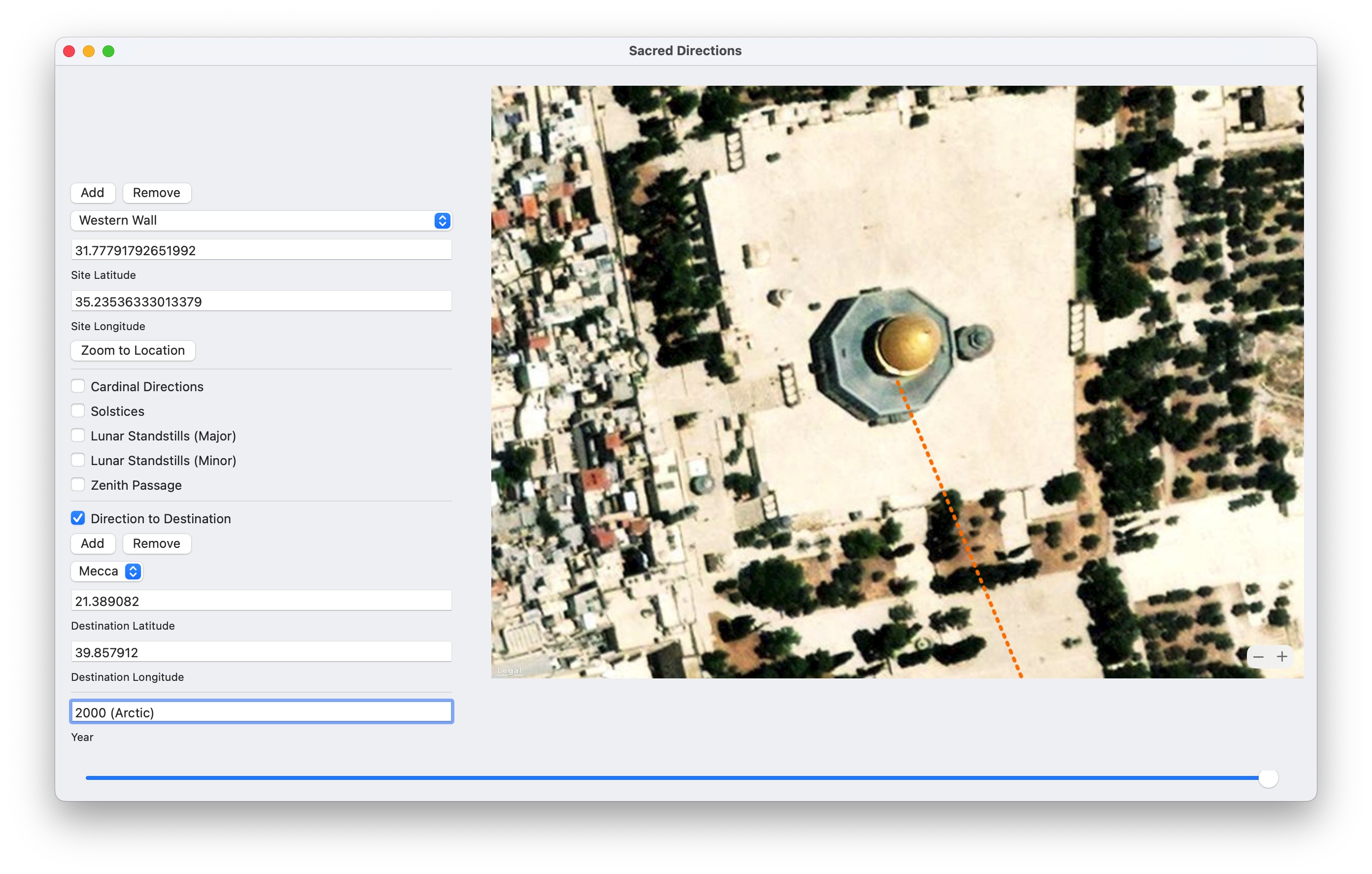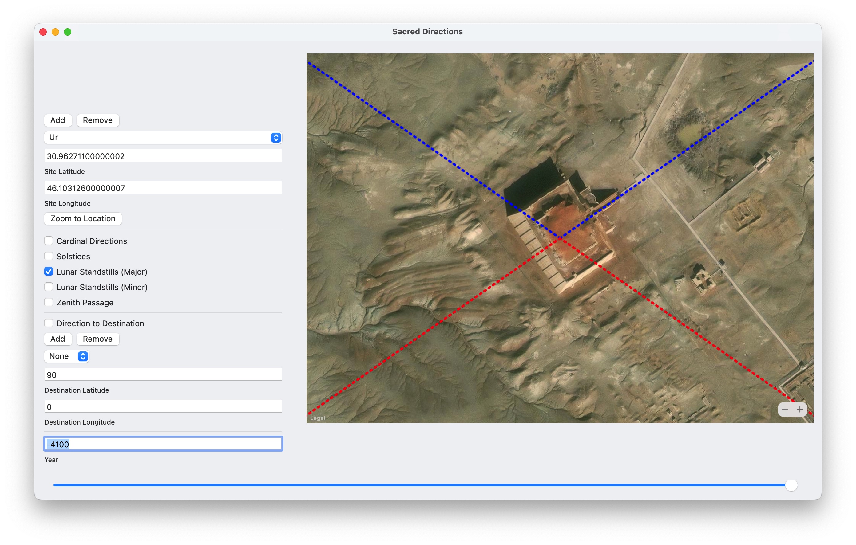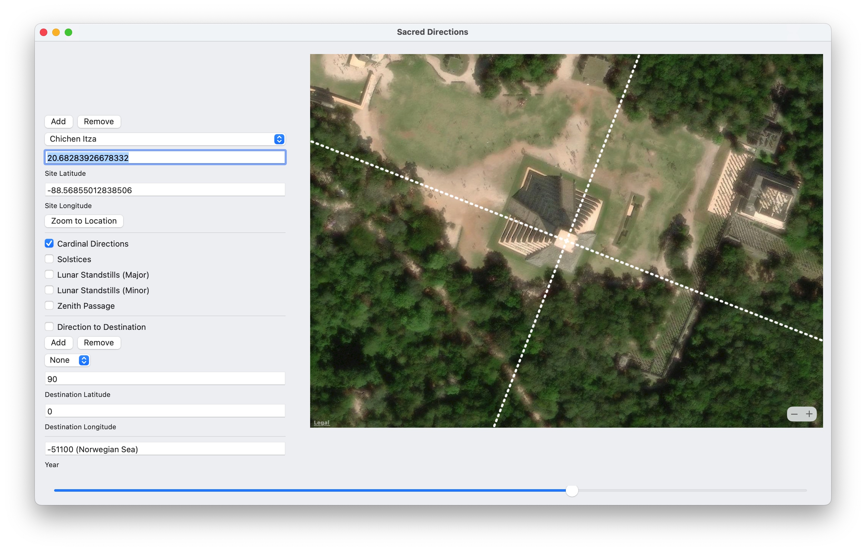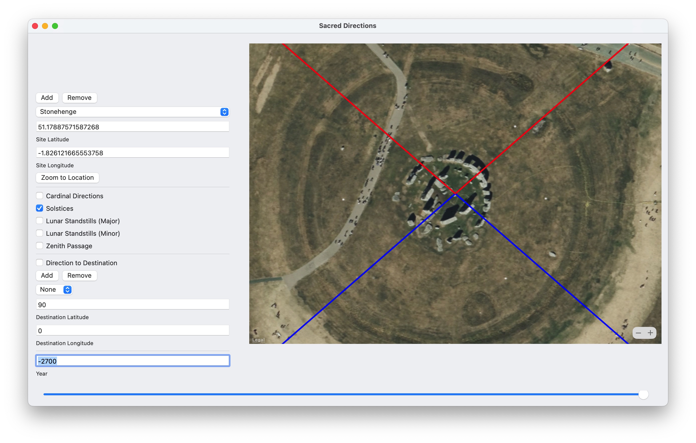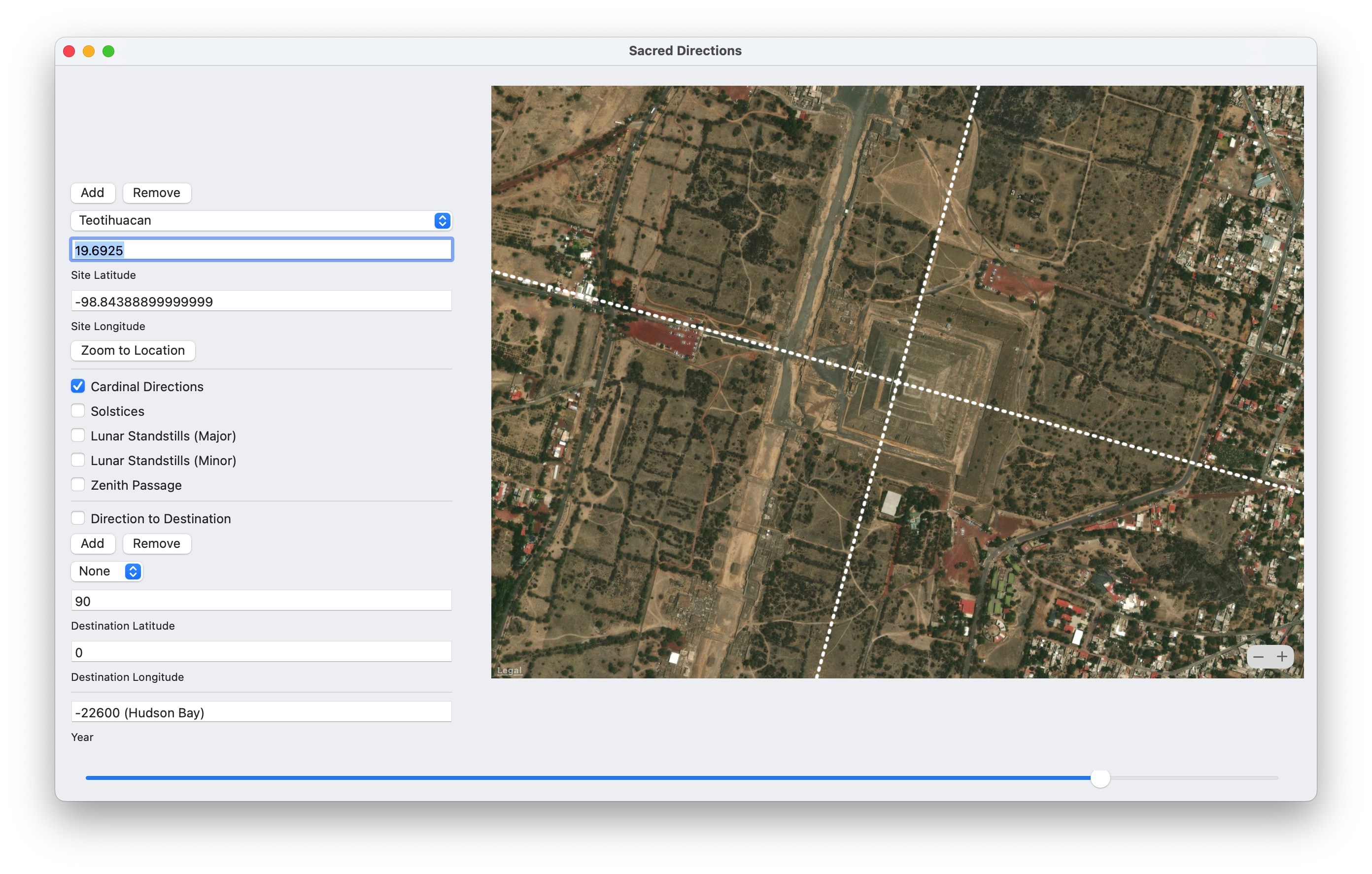 Sacred Directions is a Mac OS archaeoastronomy app that displays these directions on a satellite image at any location to understand sites in terms of their relation to the heavens and to other places on Earth.