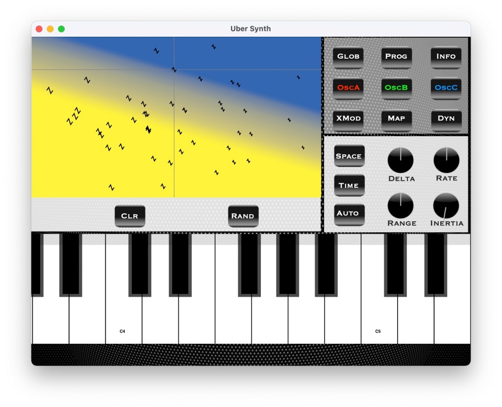 There are three other ways to blend sounds. Tap SPACE to assign sounds to different notes. Press a key and move your finger in the sound space to the sound you want. Press another key and move your finger to a different location in the sound space. Now play the keys between the two notes and notice how Uber Synth blends the two sounds. You can combine as many sounds in the sound map in this way as you like. When playing watch the sound map change as different sounds are selected and combined depending on the position of the note on the keyboard. Tap RAND to assign random sounds to notes. The variation is controlled by the RANGE knob. CLR clears the assigments.