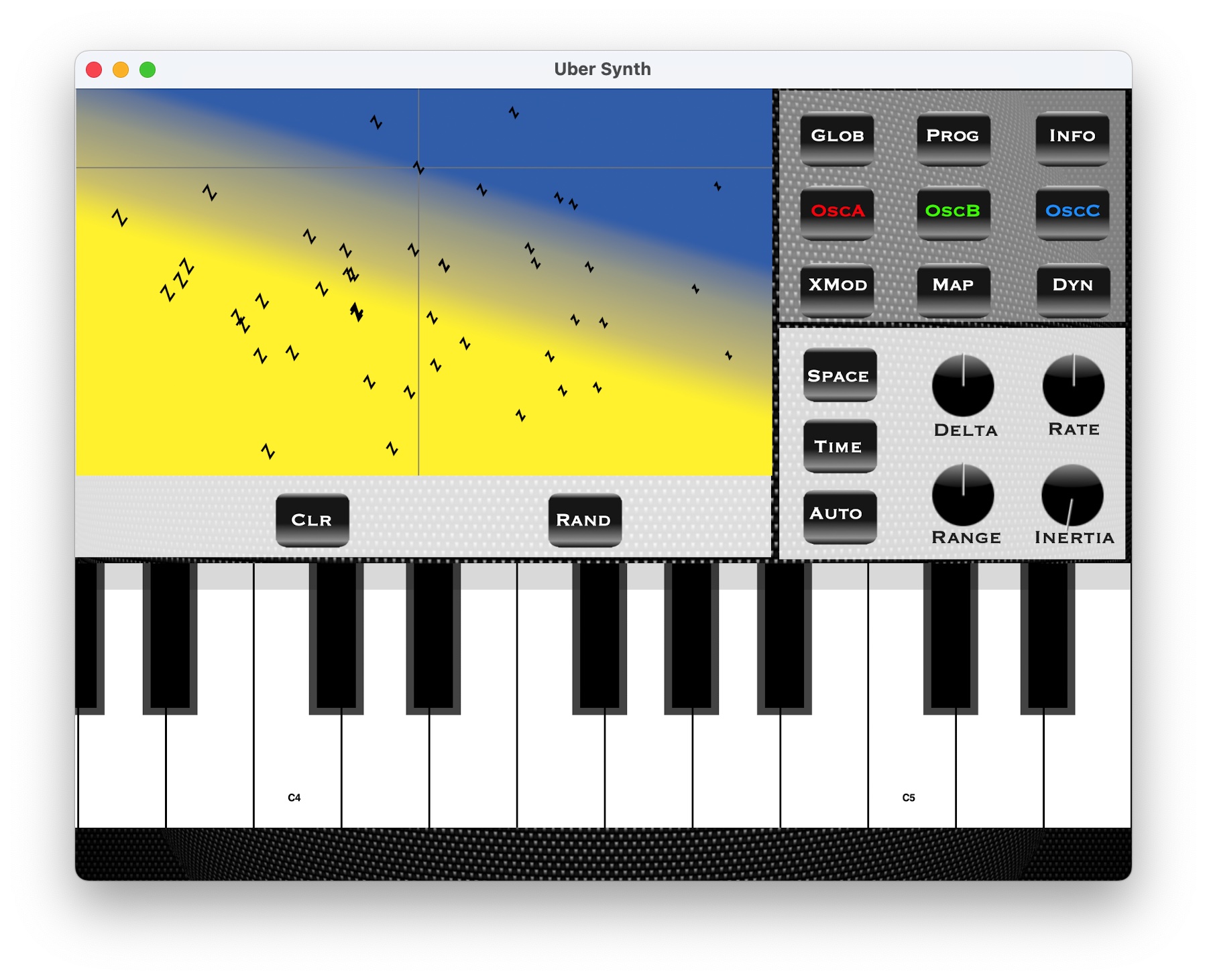 There are three other ways to blend sounds. Tap SPACE to assign sounds to different notes. Press a key and move your finger in the sound space to the sound you want. Press another key and move your finger to a different location in the sound space. Now play the keys between the two notes and notice how Uber Synth blends the two sounds. You can combine as many sounds in the sound map in this way as you like. When playing watch the sound map change as different sounds are selected and combined depending on the position of the note on the keyboard. Tap RAND to assign random sounds to notes. The variation is controlled by the RANGE knob. CLR clears the assigments.