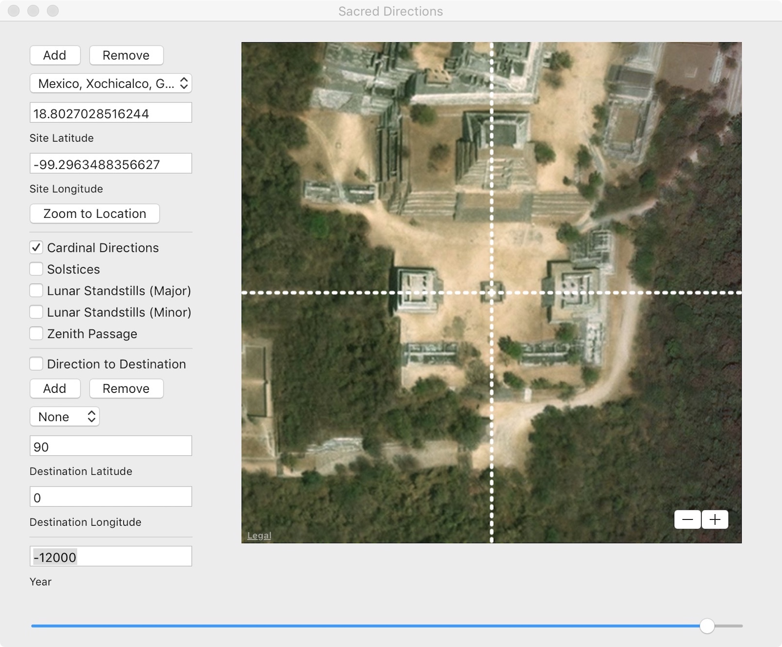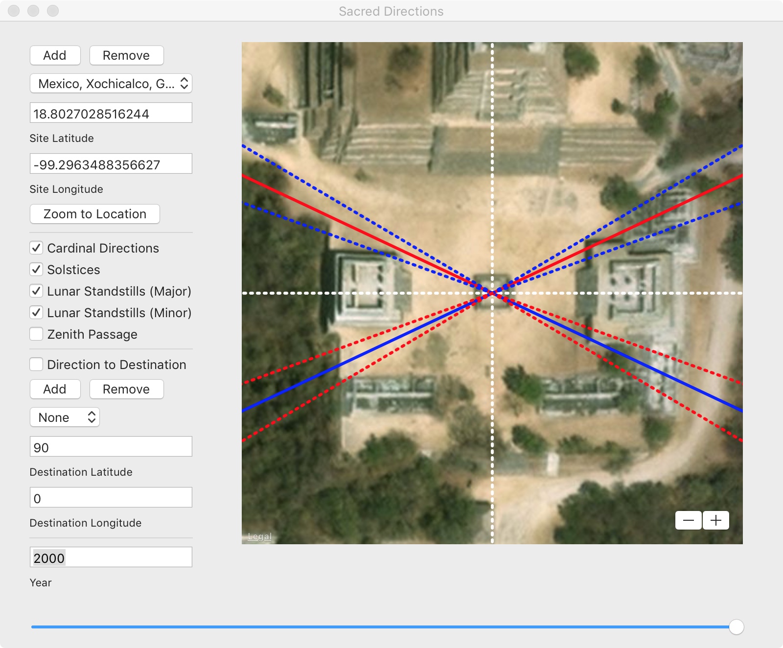 Sacred Directions is an Mac OS archaeoastronomy app that displays these directions on a satellite image at any location for the purpose of understanding a site in terms of its relation to the heavens and to other sites. Sacred Directions AR is a iOS app that displays these same directions in a augmented reality (AR) view as seen through the device’s camera.