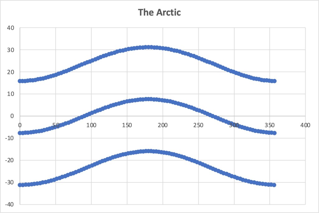 The solar path depends on your latitude, which is provided by the device’s GPS, and the time of year. Instead of plotting the path of the sun on a particular day Solar Exposure Lite plots its path on the solstices – the longest and shortest days when the sun is at its highest and lowest elevation, and in between (the equinox). The app uses standard astronomical models to determine the sun’s path. The following shows example plots (azimuth vs. elevation angle) at different latitudes.