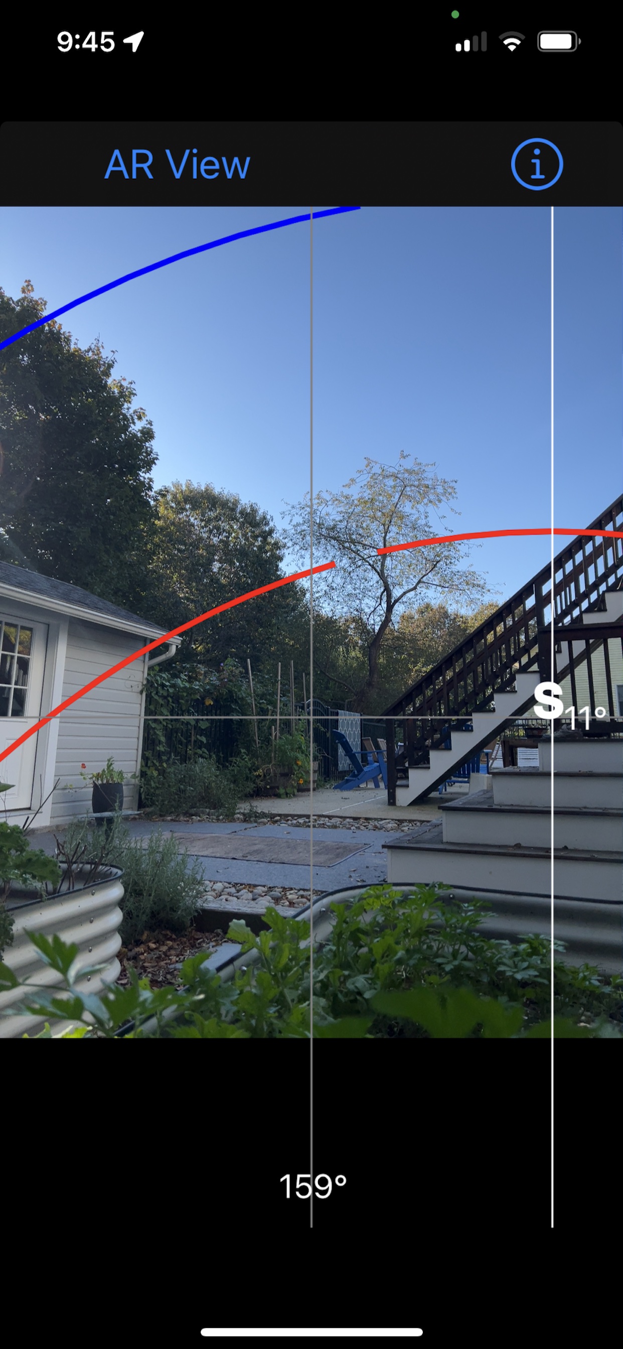 In the above augmented reality (AR) views, red is the path of the sun at the winter solstice (the shortest day), blue at the spring/fall equinoxes, and green at the summer solstice (the longest day).