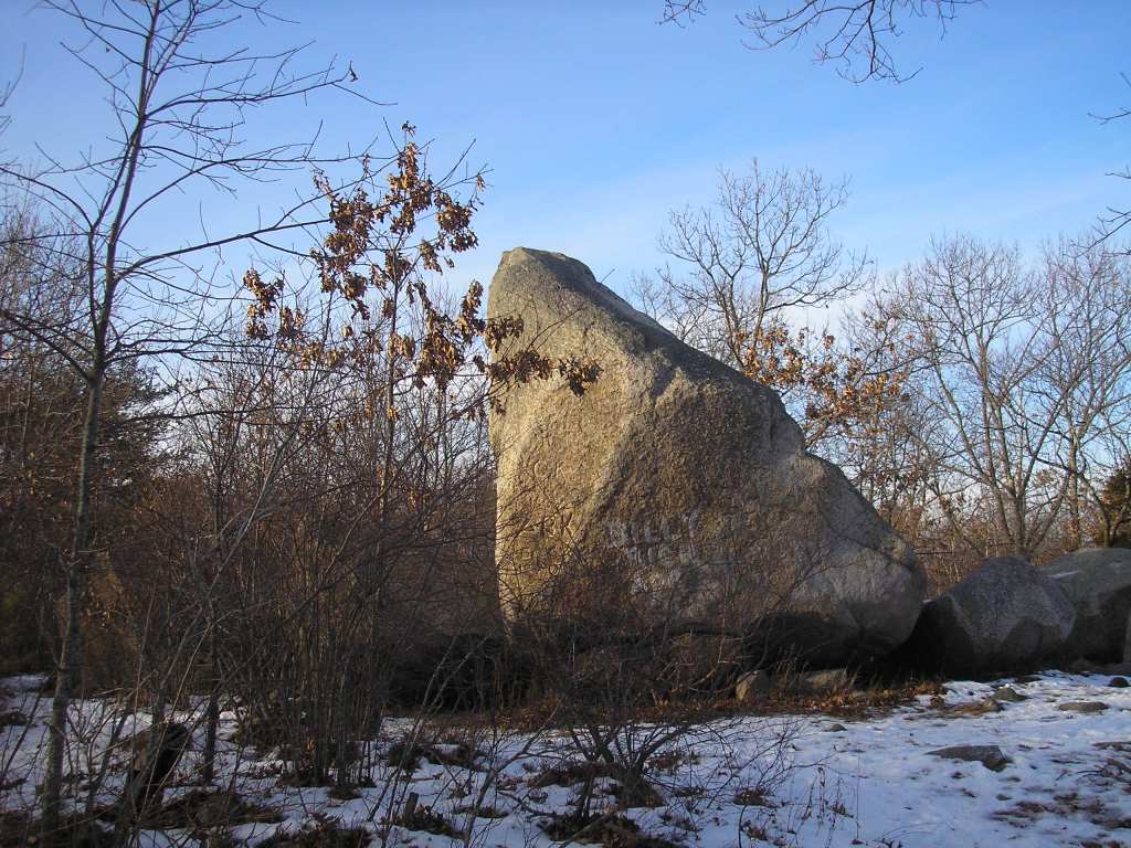 Twenty thousand years ago New England was covered by an enormous glacier. As the climate warmed and the ice melted, rocks of all shapes and sizes that had been swept up by the glacier were left behind. Water from the melting glacier shaped the landscape depositing smaller rocks and pebbles along the shoreline leaving the larger rocks known as “erratics” all over Cape Ann. The moraine south of Dogtown Square is one of the larger accumulations of glacial debris in Dogtown.