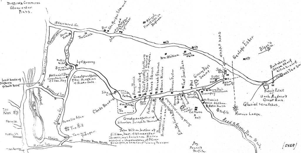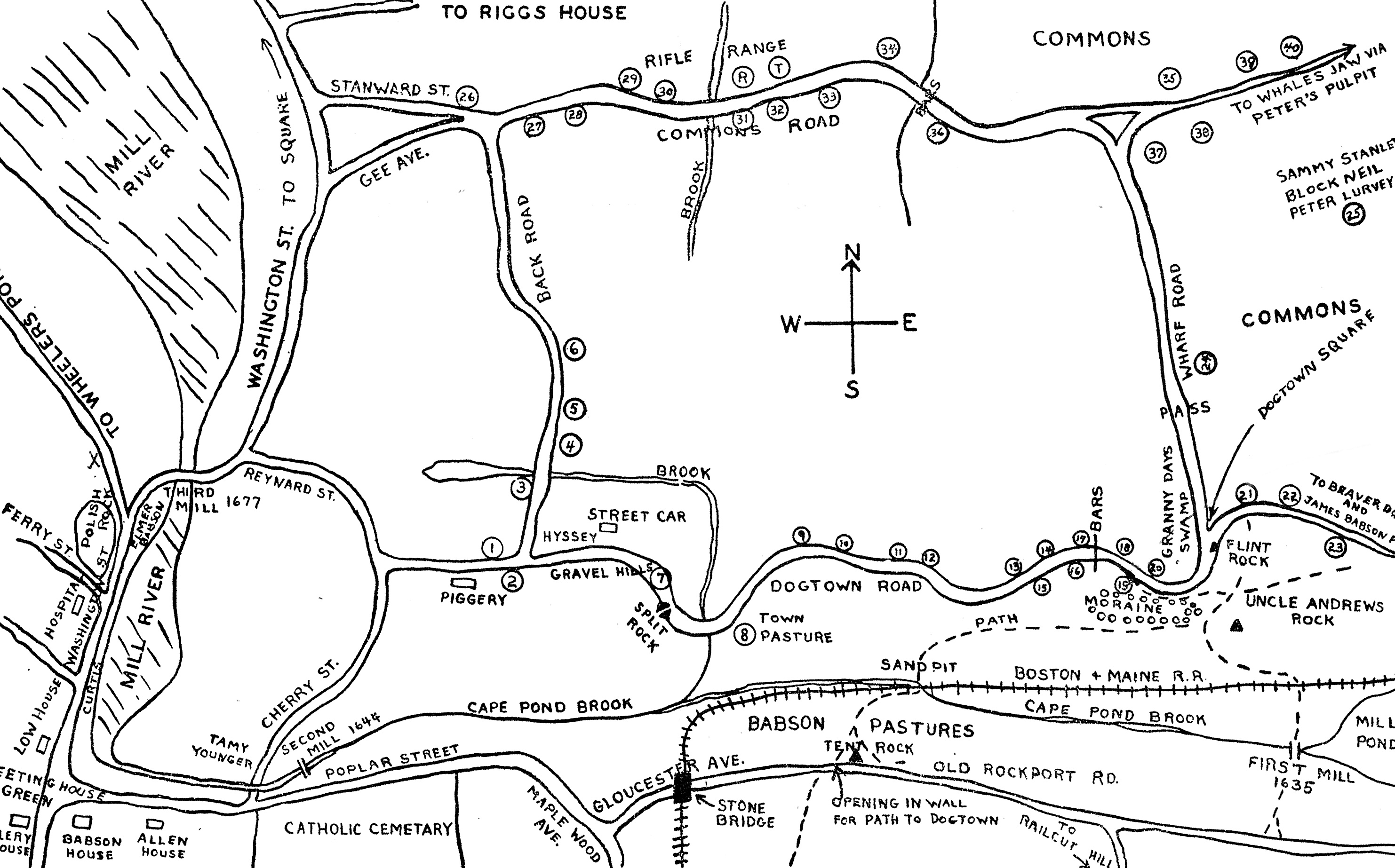 Roger W. Babson’s 1927 map from a booklet Dogtown, Gloucester’s Deserted Village later published with Foster H. Saville in the Cape Ann Tourist’s Guide.