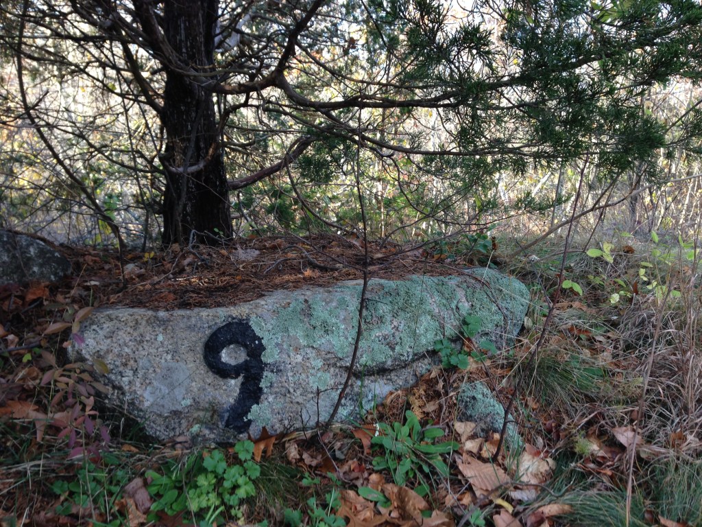 Just past a metal gate on Dogtown Road, a stone with a “9” inscribed on it marks the location of the Clark cellar.